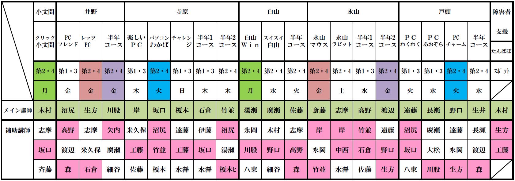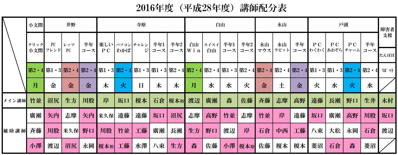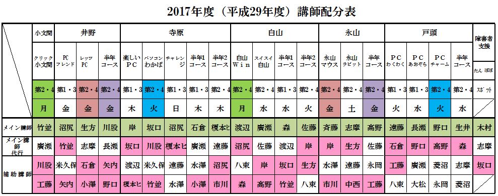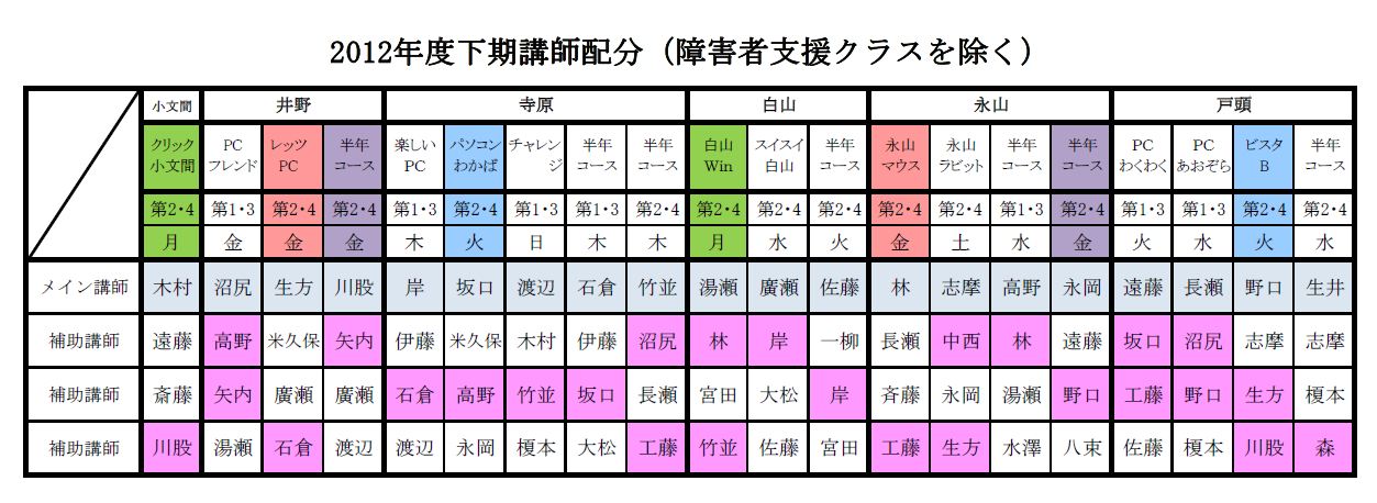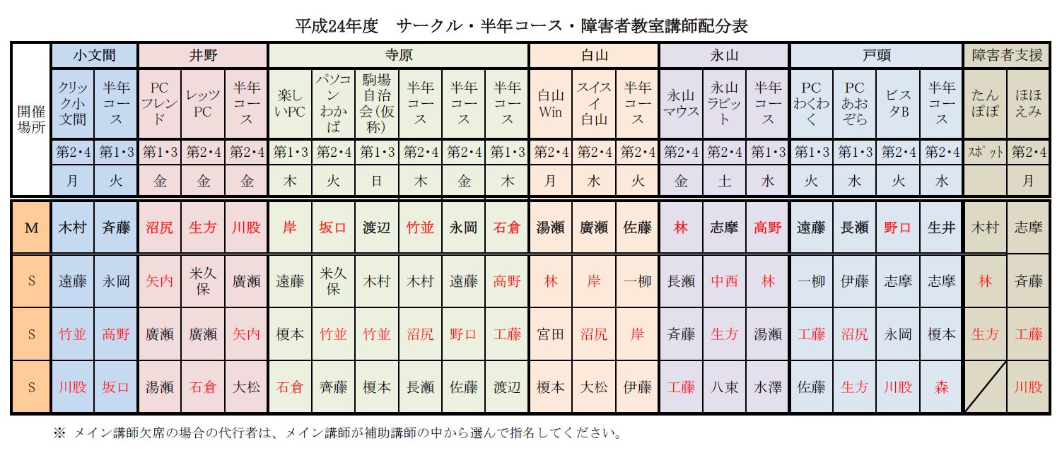 | 2017年度(平成29年度)講師配分 2016年度(平成28年度)講師配分 2015(平成27)年度講師配分 2015年度下期講師配分 2015年度上期講師配分 2014(平成26)年度講師配分 2012(平成24)年度講師配分 2012年度下期から小文間の半年コースが無くなったため下期の講師を再配分しました。サークル・半年コースの配分表を次の通り改正しましたが、障害者支援クラスの講師配分に変更はなく、下部の2012年度講師配分表のままです。 2012年度講師配分 |