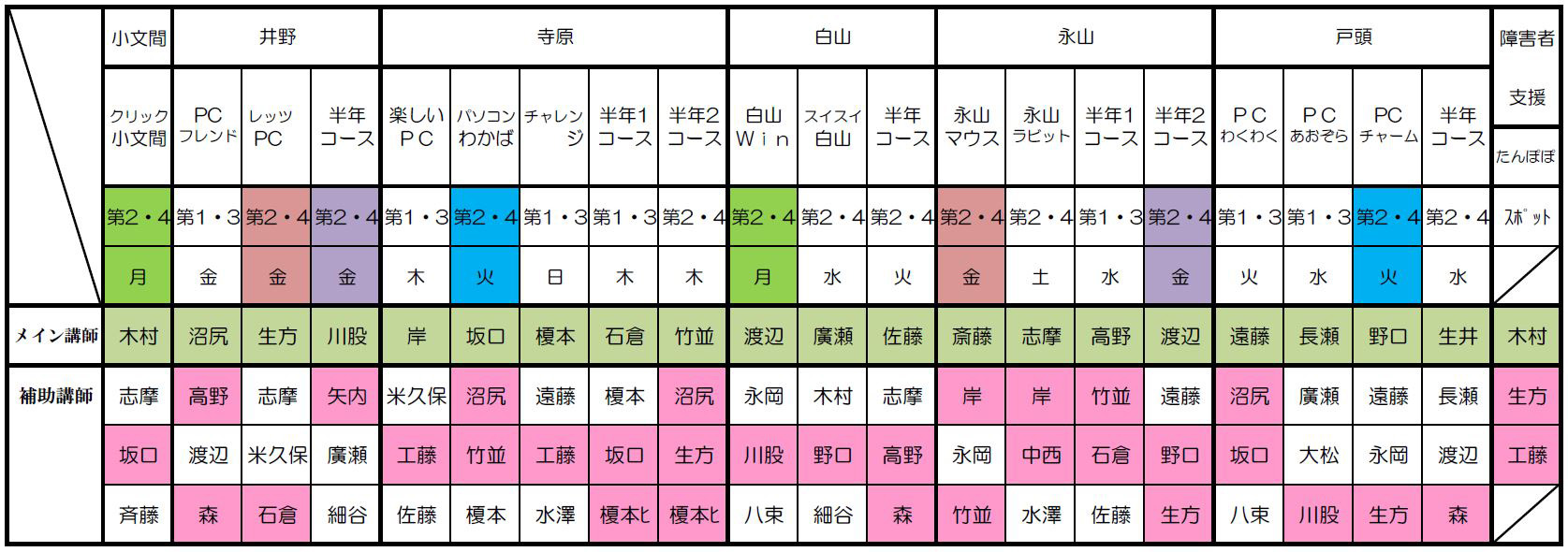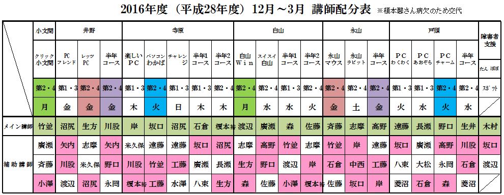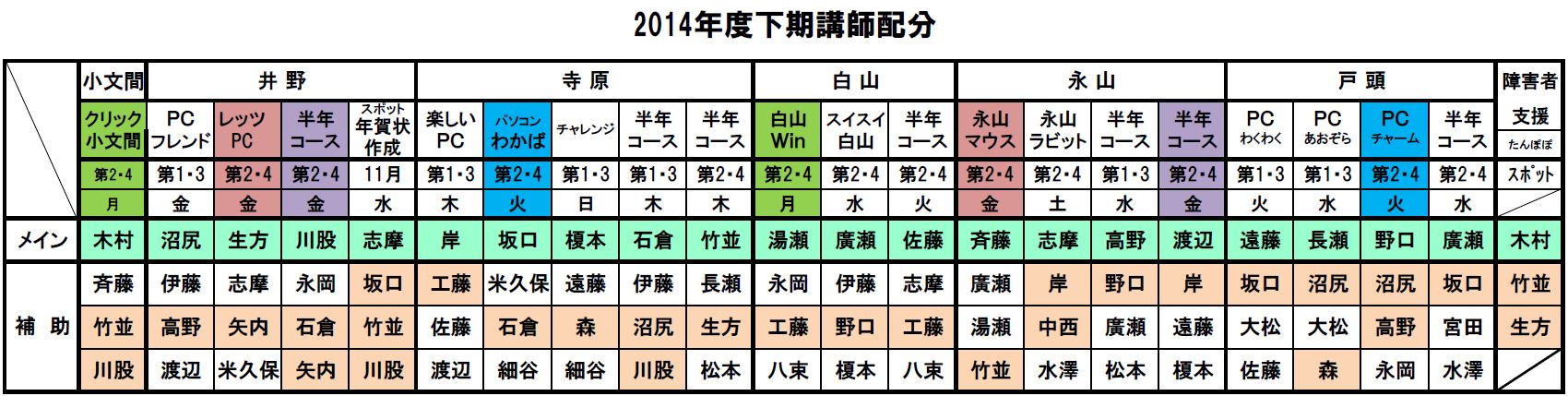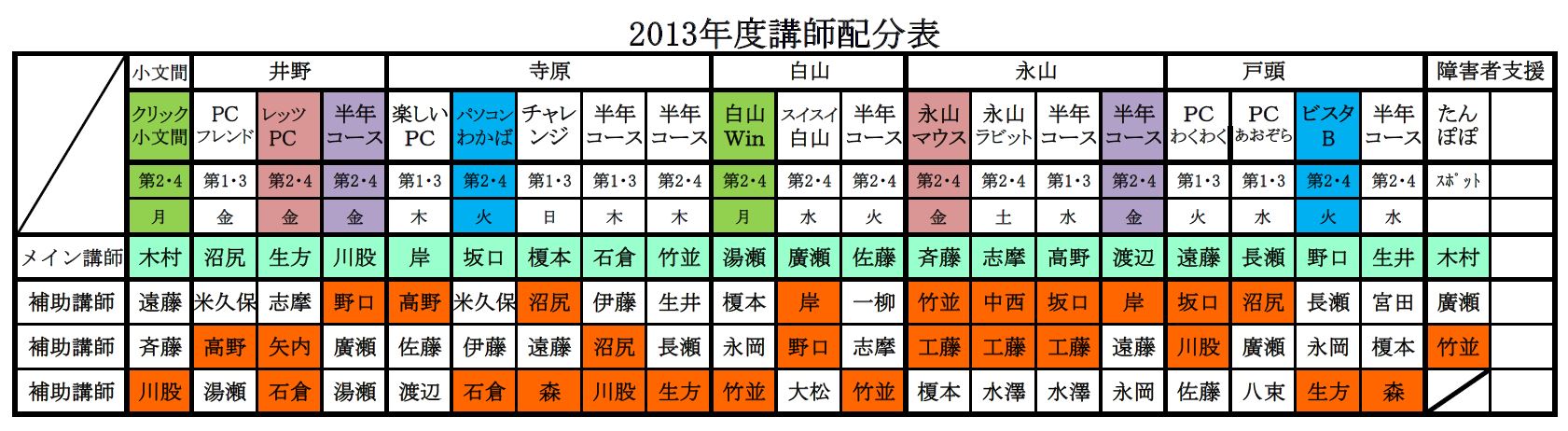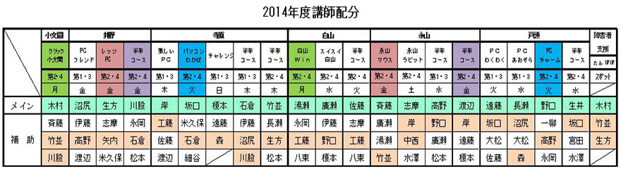 | 2017年度(平成29年度)講師配分 2016年度(平成28年度)講師配分 2015(平成27)年度講師配分 2015年度下期講師配分 2015年度上期講師配分 2014(平成26)年度講師配分 2012(平成24)年度講師配分 2012年度下期から小文間の半年コースが無くなったため下期の講師を再配分しました。サークル・半年コースの配分表を次の通り改正しましたが、障害者支援クラスの講師配分に変更はなく、下部の2012年度講師配分表のままです。 2012年度講師配分 |